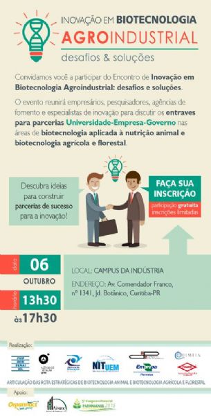 O evento é uma iniciativa da Articulação das Rotas Estratégicasdo Setor de Biotecnologia Animal, Agrícola e Florestal e será realizado no dia 06 de outubro, no Sistema Fiep – Campus da Indústria.