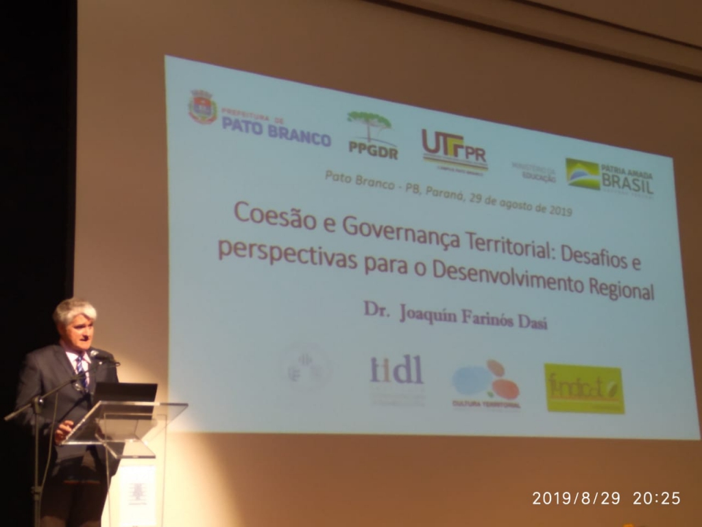 Na data de 29 de agosto, aconteceu no Teatro Sesi de Pato Branco a Palestra com o professor Dr. Joaquim Farinós Dási da Universidade de Valência - Espanha. O evento foi articulado pela Diretoria Geral da UTFPR Campus de Pato Branco, juntamente com a Coordenação do Programa de Pós - Graduação em Desenvolvimento Regional (PPGDR), em parceria com a Prefeitura Municipal e a Secretaria Municipal de Ciência, Tecnologia e Inovação de Pato Branco.