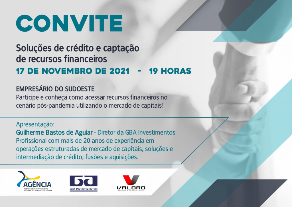 A Agência de Desenvolvimento convida sua empresa para participar da capacitação: Soluções de Crédito e Captação de Recursos Financeiros. O link de inscrição é: https://forms.office.com/r/yxtNtyzGGe. Será no dia 17 de novembro (quarta-feira) às 19 horas no link: https://teams.microsoft.com/l/meetup-join/19%3ameeting_ZmFmYTNhNGQtMzk0OC00ZTY1LWI1OTctNzExOGEzYzMwM....